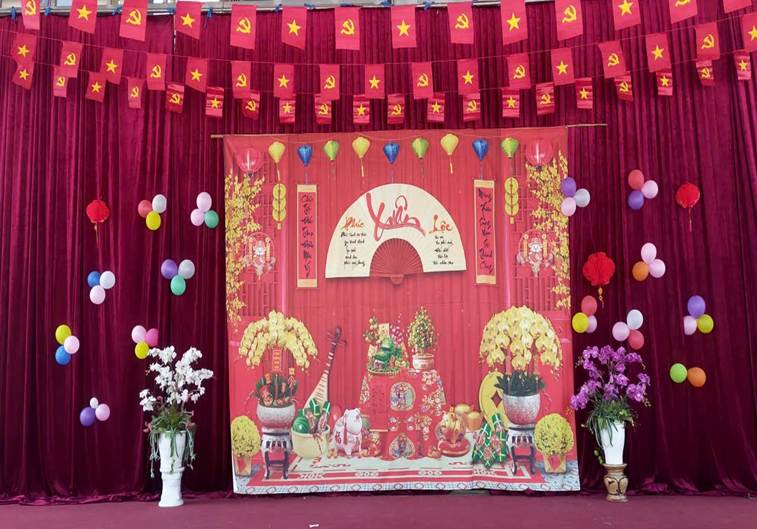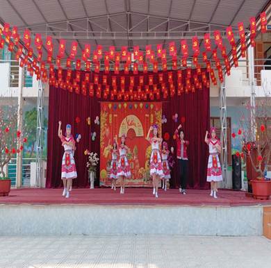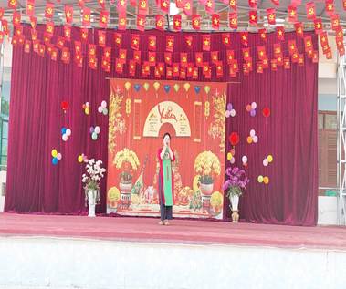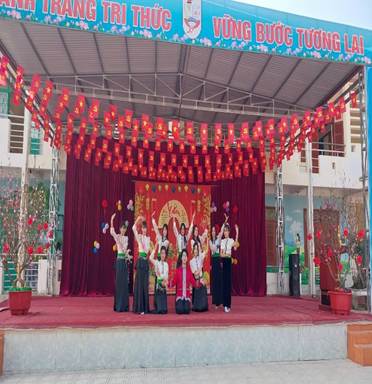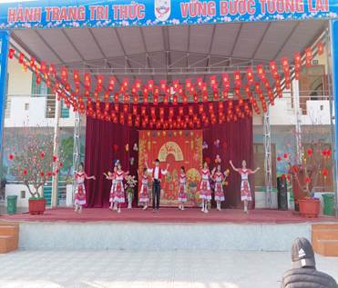 Ngay từ khu vực sân khấu trung tâm, không gian xuân đã được tái hiện sinh động với cờ đỏ sao vàng rực rỡ, câu đối đỏ, hoa đào, hoa mai, tạo nên một khung cảnh ấm áp, tươi vui. Các tiết mục văn nghệ đặc sắc do chính các em học sinh biểu diễn trong trang phục truyền thống dân tộc đã mở đầu chương trình trong niềm hân hoan, phấn khởi của toàn thể thầy cô, học sinh và phụ huynh.