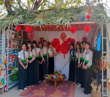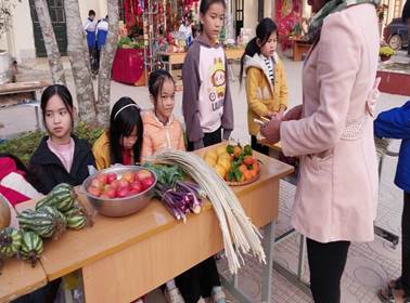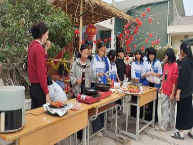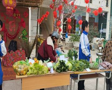 Song song với hoạt động gói bánh là “Chợ xuân học đường”, nơi các gian hàng được trang trí mang đậm bản sắc văn hóa địa phương. Những sản phẩm quen thuộc của ngày Tết như rau xanh, hoa quả, bánh trái, đồ thủ công… được chính học sinh và phụ huynh chuẩn bị, trưng bày và giới thiệu. Chợ xuân không chỉ tạo nên không khí náo nhiệt, gần gũi mà còn giúp các em rèn luyện kỹ năng giao tiếp, làm việc nhóm, tinh thần trách nhiệm và ý thức tiết kiệm.