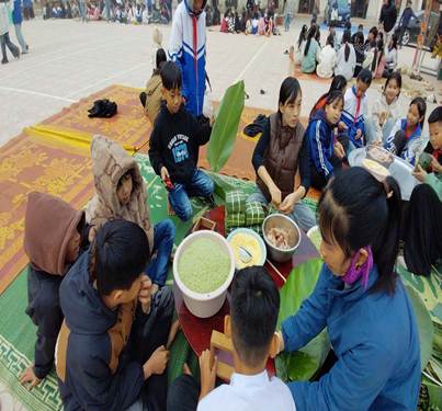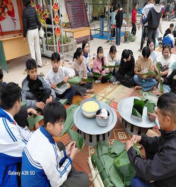 Điểm nhấn nổi bật của hoạt động là trải nghiệm gói bánh chưng – một nét đẹp không thể thiếu mỗi dịp Tết đến xuân về. Dưới sự hướng dẫn tận tình của thầy cô và người lớn, các em học sinh được trực tiếp rửa lá dong, đong gạo nếp, xếp khuôn, buộc lạt, tự tay làm nên những chiếc bánh chưng vuông vắn, nghĩa tình. Qua đó, các em hiểu hơn về ý nghĩa của bánh chưng – biểu tượng của lòng biết ơn tổ tiên, của tinh thần đoàn kết và truyền thống gia đình Việt.